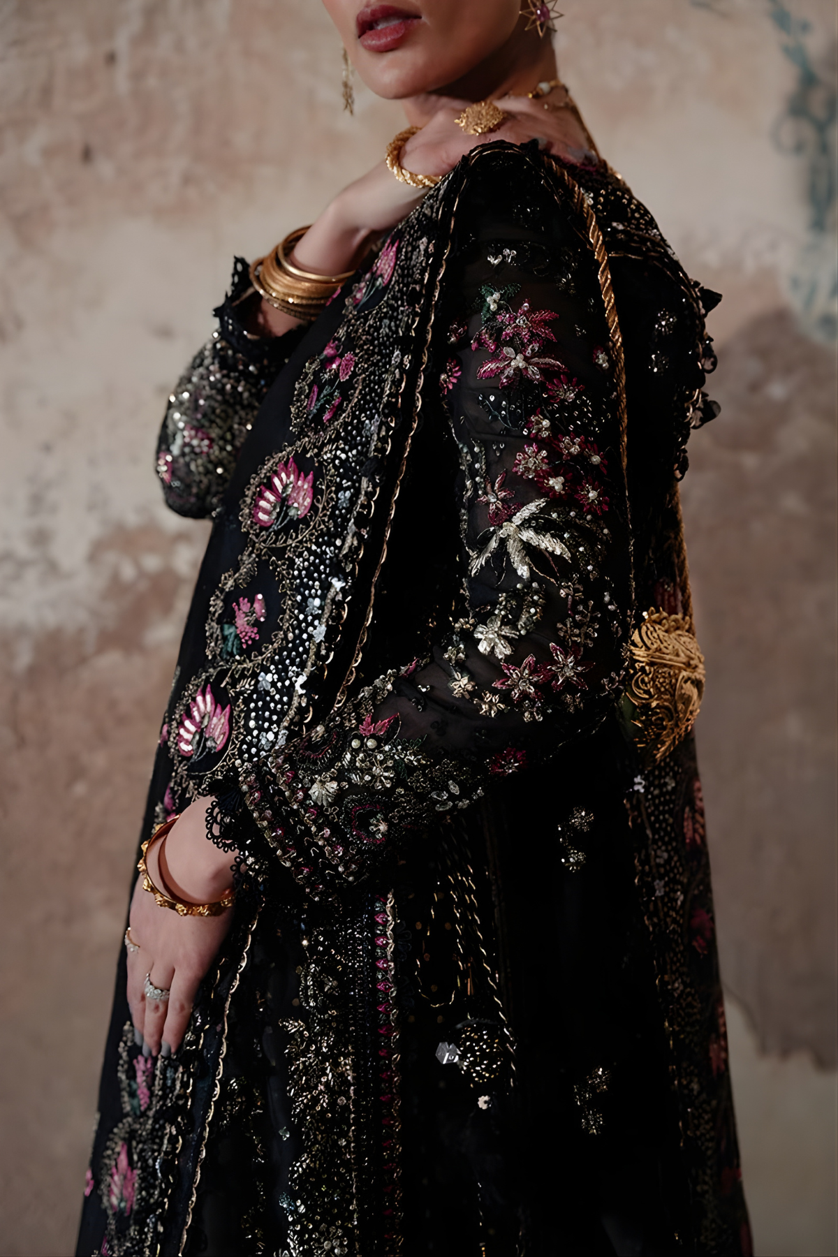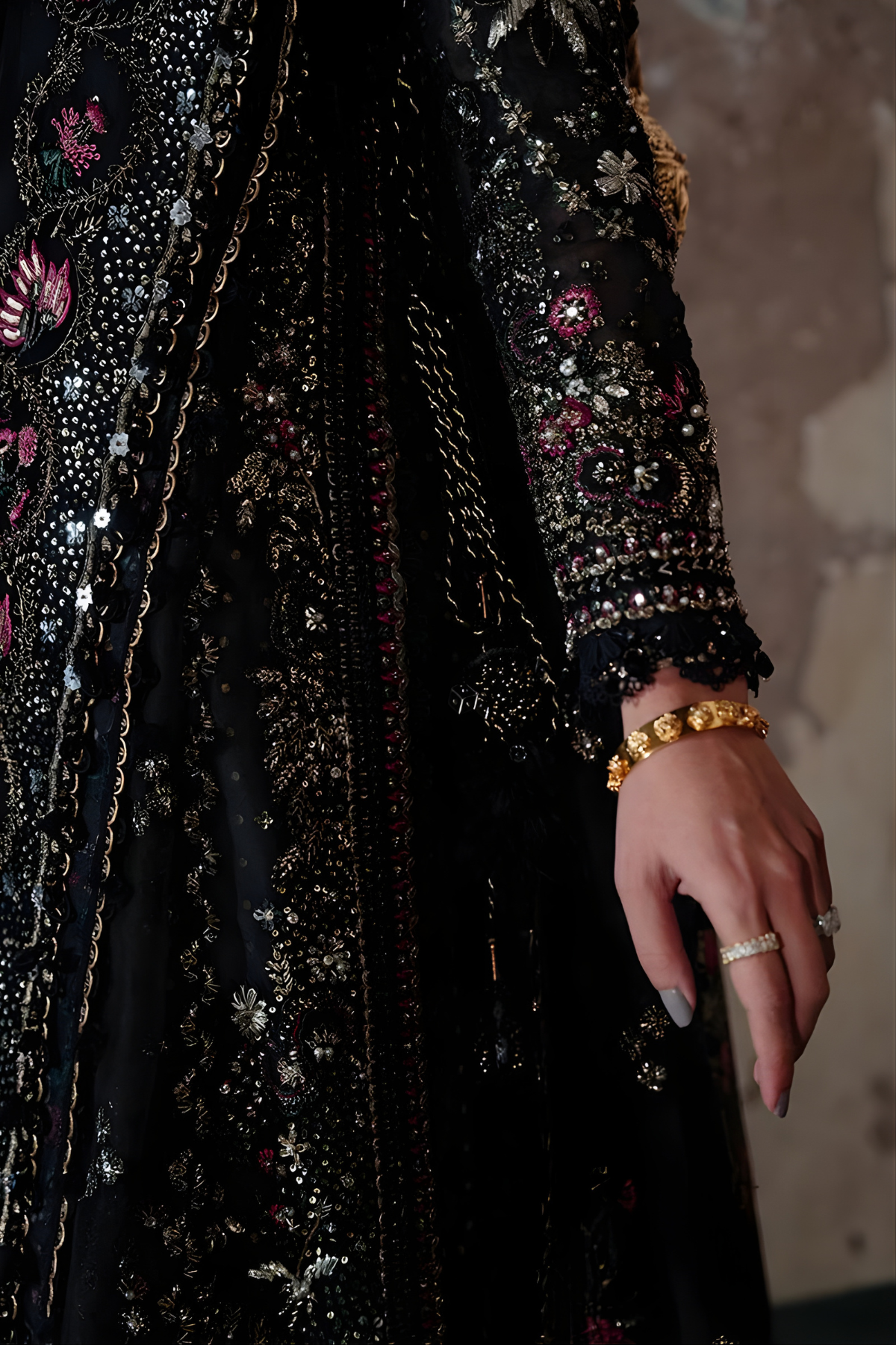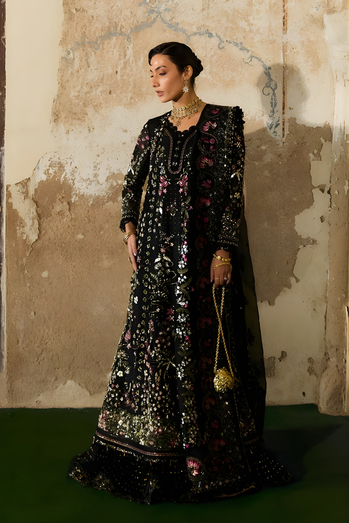 The flowing black organza long shirt paired with a stylish sharara creates a graceful silhouette. Intricate embroidery and embellishments ensure none of your bridal elegance goes unnoticed, making this a statement-making formal outfit.
