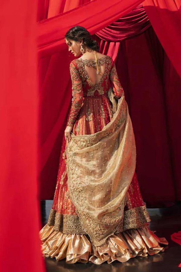 Dupatta: Tastefulness and marvelousness dance softly inside this entrancing masterpiece. Our marriage pieces inject legacy with delicious design and everlasting charm making it ideal for your wedding festivity. Gold jaali with huge sequins chann is weaved on dupatta. A dash of wizardry on your important day, with a Red Lehenga Pishwas, is certainly what you need. Followed by an impeccable dupatta and a lehenga, this enchanting wear will be your justification for esteem on your Nikkah or Gathering day.
