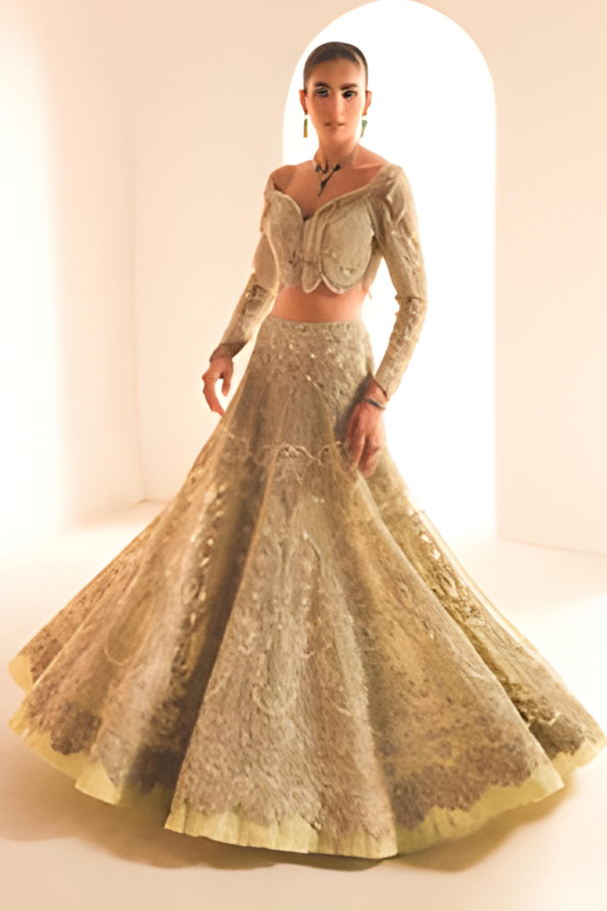 The net lehnga and choli are designed to create a graceful silhouette, ensuring none of your bridal elegance goes unnoticed and adding more softness and sophistication to your wedding style.