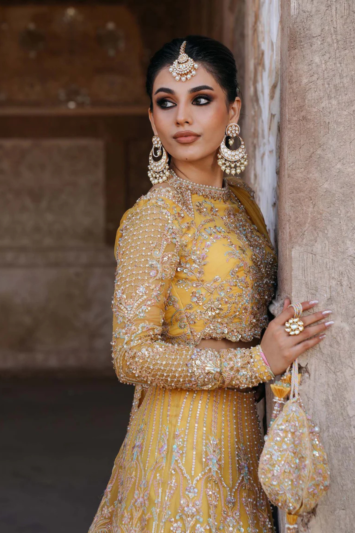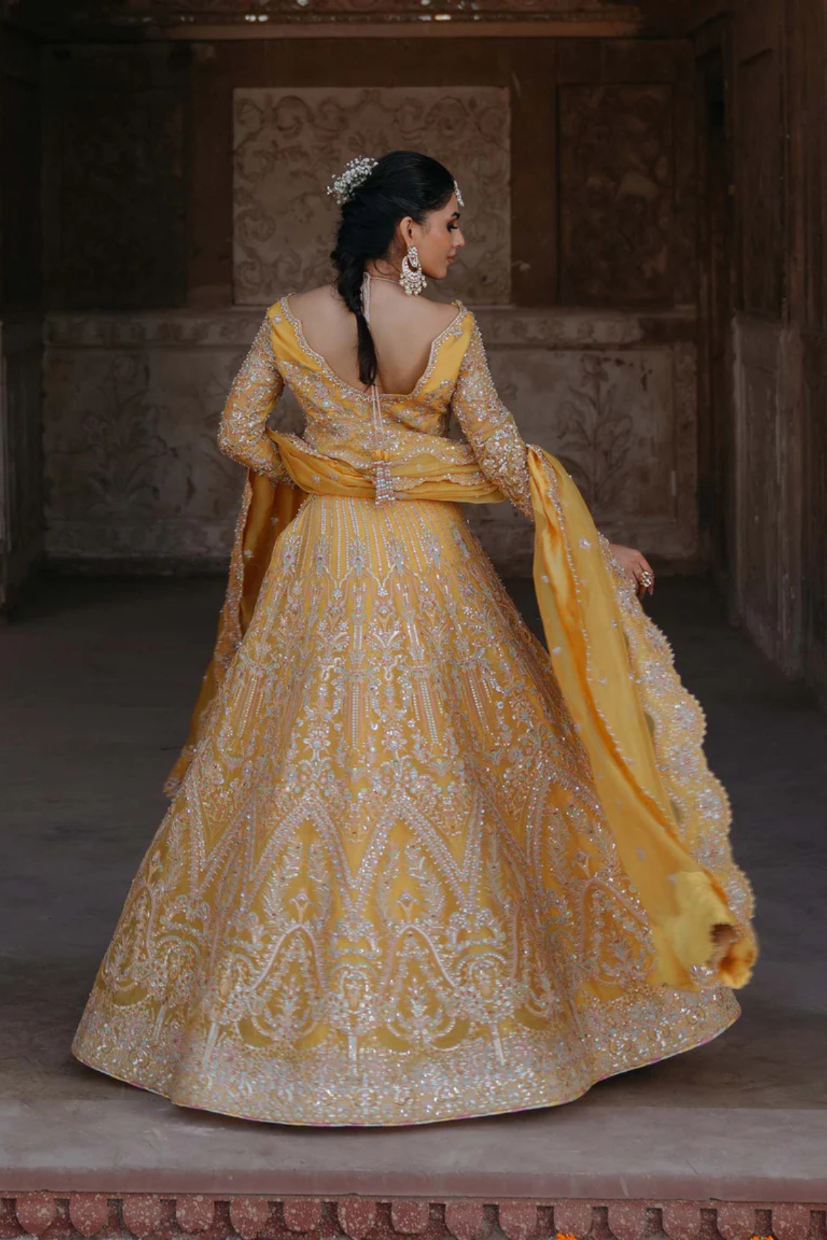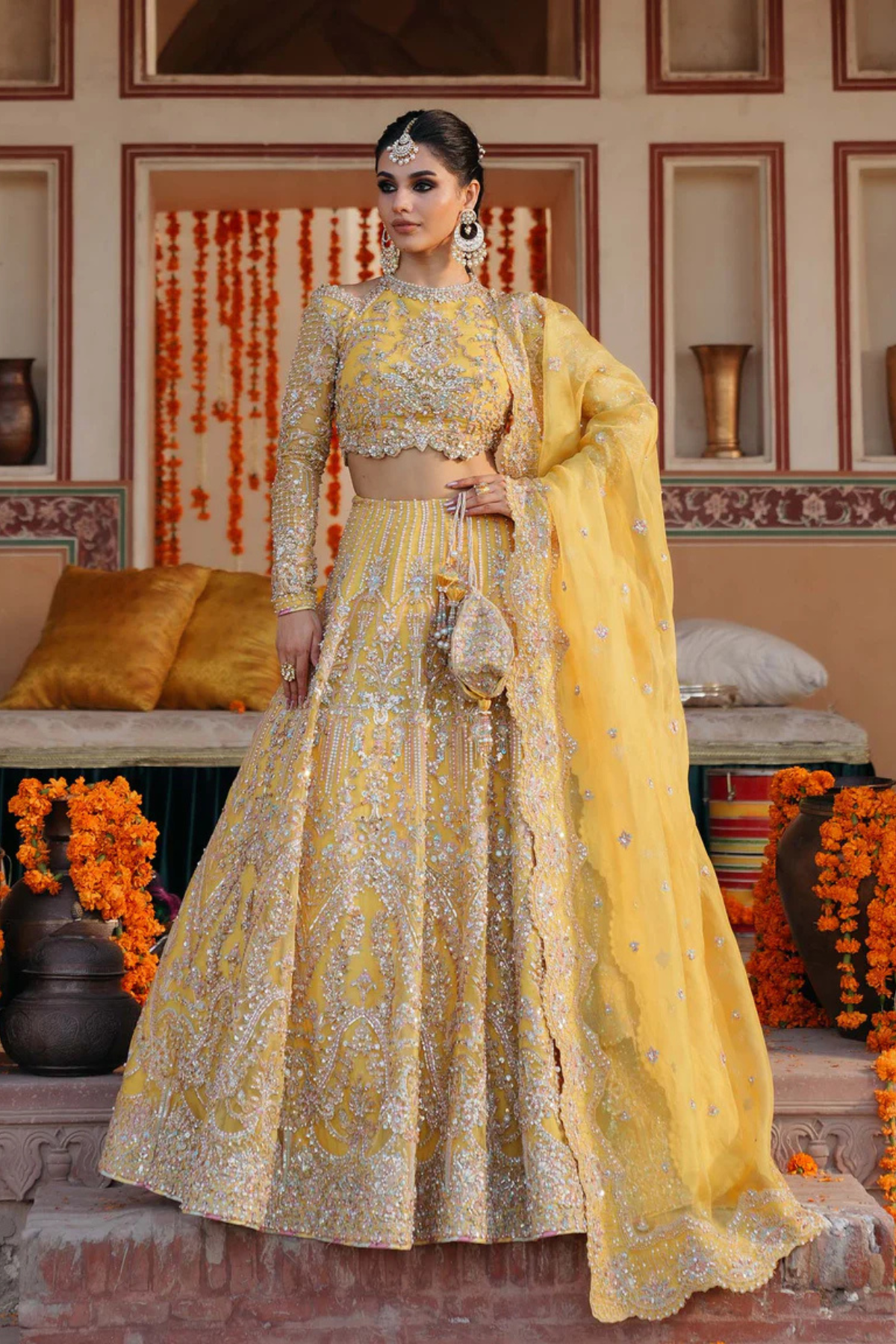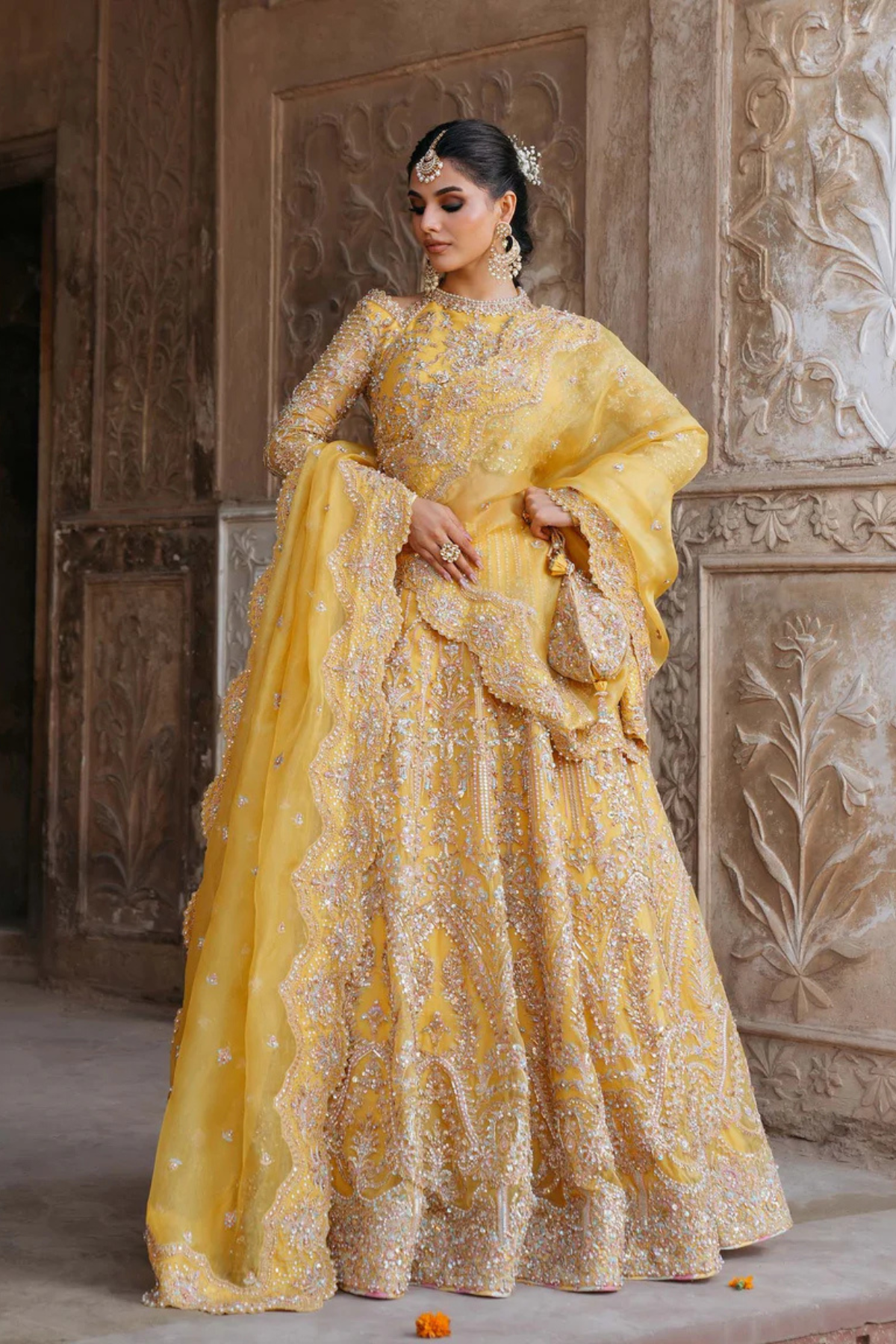 Pakistani Bridal Lehenga Choli Yellow Kathaan Organza
