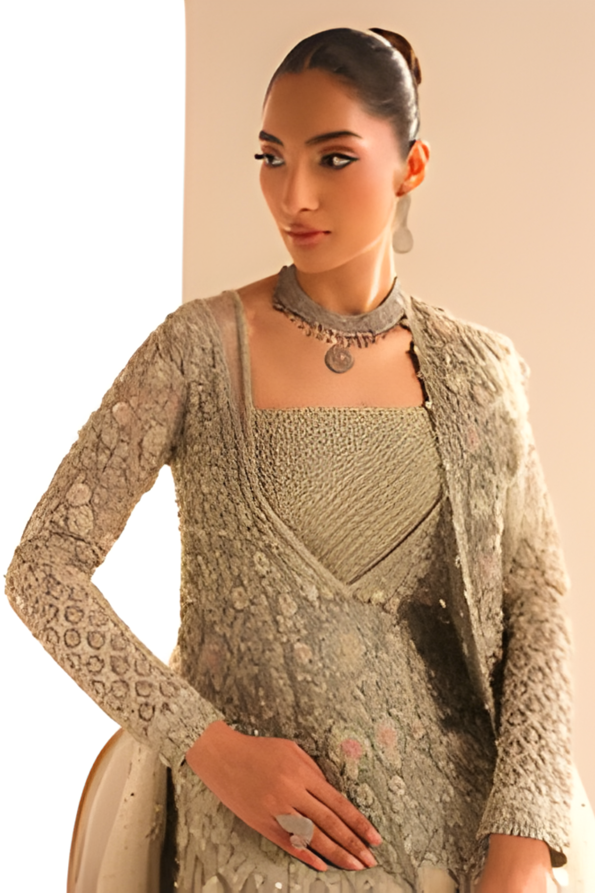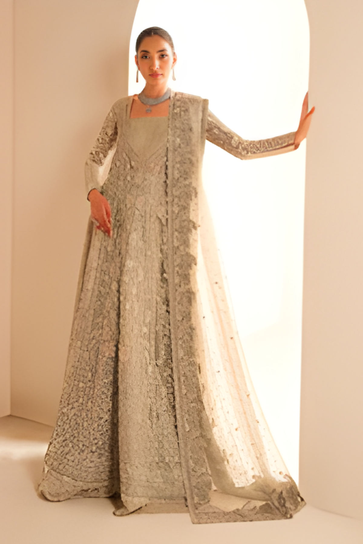 Move into refined luxury with this stunning Pakistani Bridal Lehnga Gown Set in an exquisite silver grey shade. Designed to reflect grace and sophistication, this bridal ensemble brings more charm and modern elegance to your wedding look.