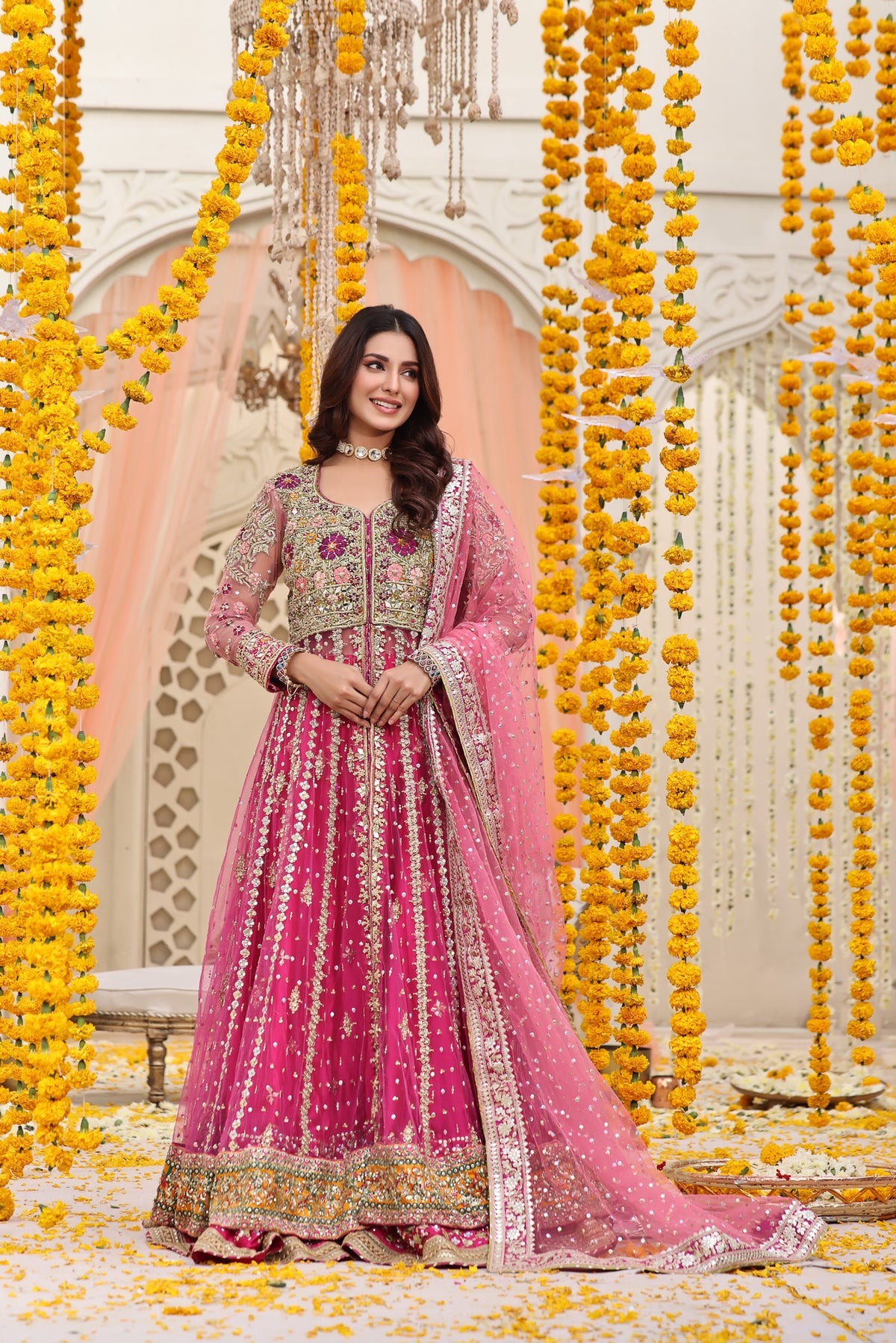 This Pishwas Frock in a captivating pink hue is crafted with a blend of traditional and contemporary designs. Featuring hand-embroidered Dabka, Kora, crystals, and Gota work, it exudes elegance and sophistication. The open-style frock, made from premium silk net fabric, is further enhanced with multi-colored thread floral designs that give it a vibrant and luxurious appeal, making it an ideal choice for the Mehndi ceremony.