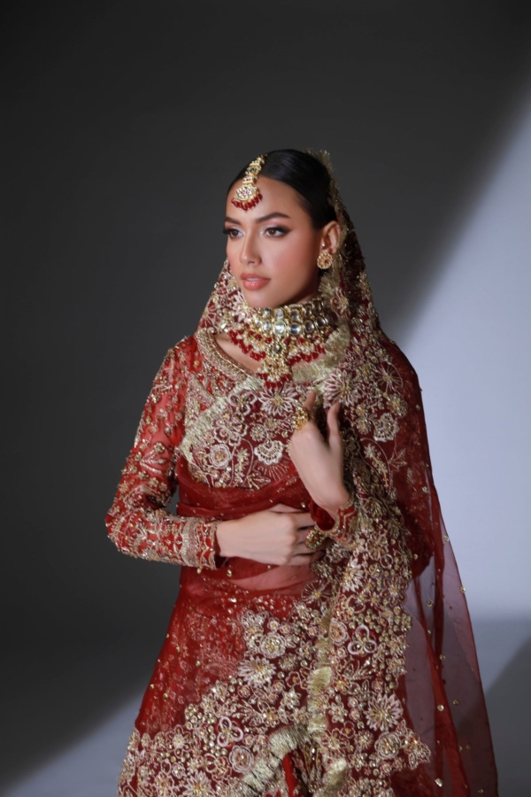 The bridal ensemble achieves its final enchanting look with the addition of a delicate net dupatta. This lightweight yet luxurious accessory is embellished with embroidered borders, floral motifs, and sitara work. Moreover, The shimmering accents and intricate detailing blend seamlessly with the lehenga choli, elevating the overall aesthetic of the dress. The dupatta’s elegance adds a graceful touch, ensuring the bride looks nothing short of radiant. Moreover, this Pakistani Bridal Red Lehenga is designed to make every bride feel truly special. Moreover, Combining opulent design elements with unmatched craftsmanship, this ensemble ensures a head-turning appearance that captures the essence of beauty and tradition.Detailed Description